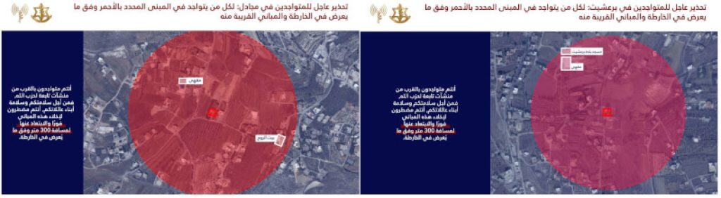 IDF Arabic Language Spokesman Avichay Adraee’s warnings to the residents of Majadel (Left) and Braasheet (Right). (Avichay Adraee on Telegram)