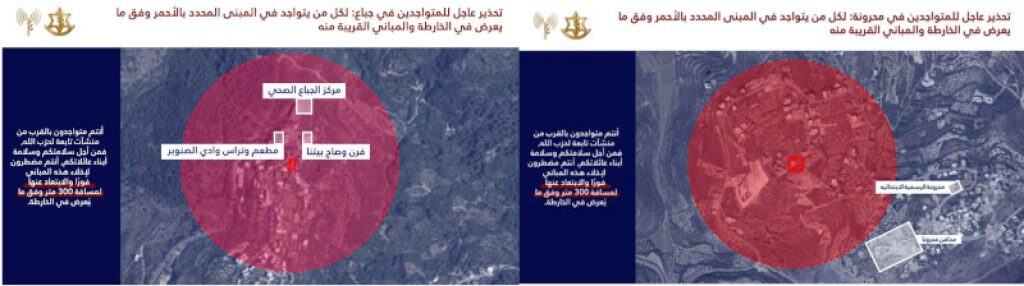 IDF Arabic Language Spokesman Avichay Adraee’s warnings to the residents of Jbaa (Left) and Mahrouneh (Right). (Avichay Adraee on Telegram)